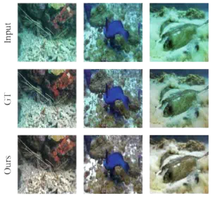 Enhancing image quality is crucial for achieving an accurate and reliable image analysis in vision-based automated tasks. Underwater imaging encounters several challenges that can negatively impact image quality, including limited visibility, color distortion, contrast sensitivity issues, and blurriness. Among these, depending on how the water filters out the different light colors at different depths, the color distortion results in a loss of color information and a blue or green tint to the overall image, making it difficult to identify different underwater organisms or structures accurately. Improved underwater image quality can be crucial in marine biology, oceanography, and oceanic exploration. Therefore, this paper proposes a novel Generative Adversarial Network (GAN) architecture for underwater image enhancement, restoring good perceptual quality to obtain a more precise and detailed image. The effectiveness of the proposed method is evaluated on the EUVP dataset, which comprises underwater image samples of various visibility conditions, achieving remarkable results. Moreover, the trained network is run on the RPi4B as an embedded system to measure the time required to enhance the images with limited computational resources, simulating a practical underwater investigation setting. The outcome demonstrates the presented method applicability in real-world underwater exploration scenarios.
